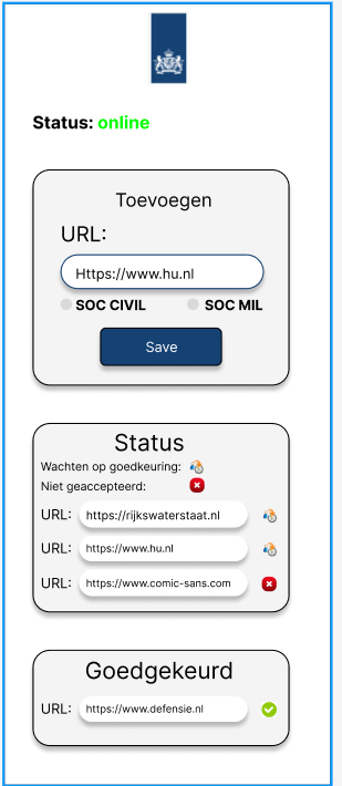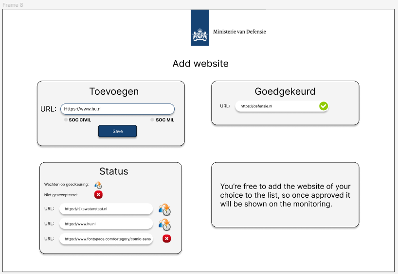 Mobiel: zoals u ziet kun je (ieder Defensie persoon) een website toevoegen (en aangeven over het een civiel of militair domein is en dan met de andere website op de dashboard komen, eenmaal goedgekeurd.
